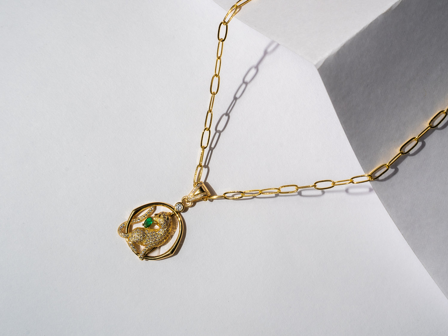 Unleash your inner power with this dazzling gold panther pendant—encrusted with fine stones and crowned with a striking emerald accent. Symbolizing strength, grace, and fierce individuality, this piece is designed for the woman who leads with bold elegance.