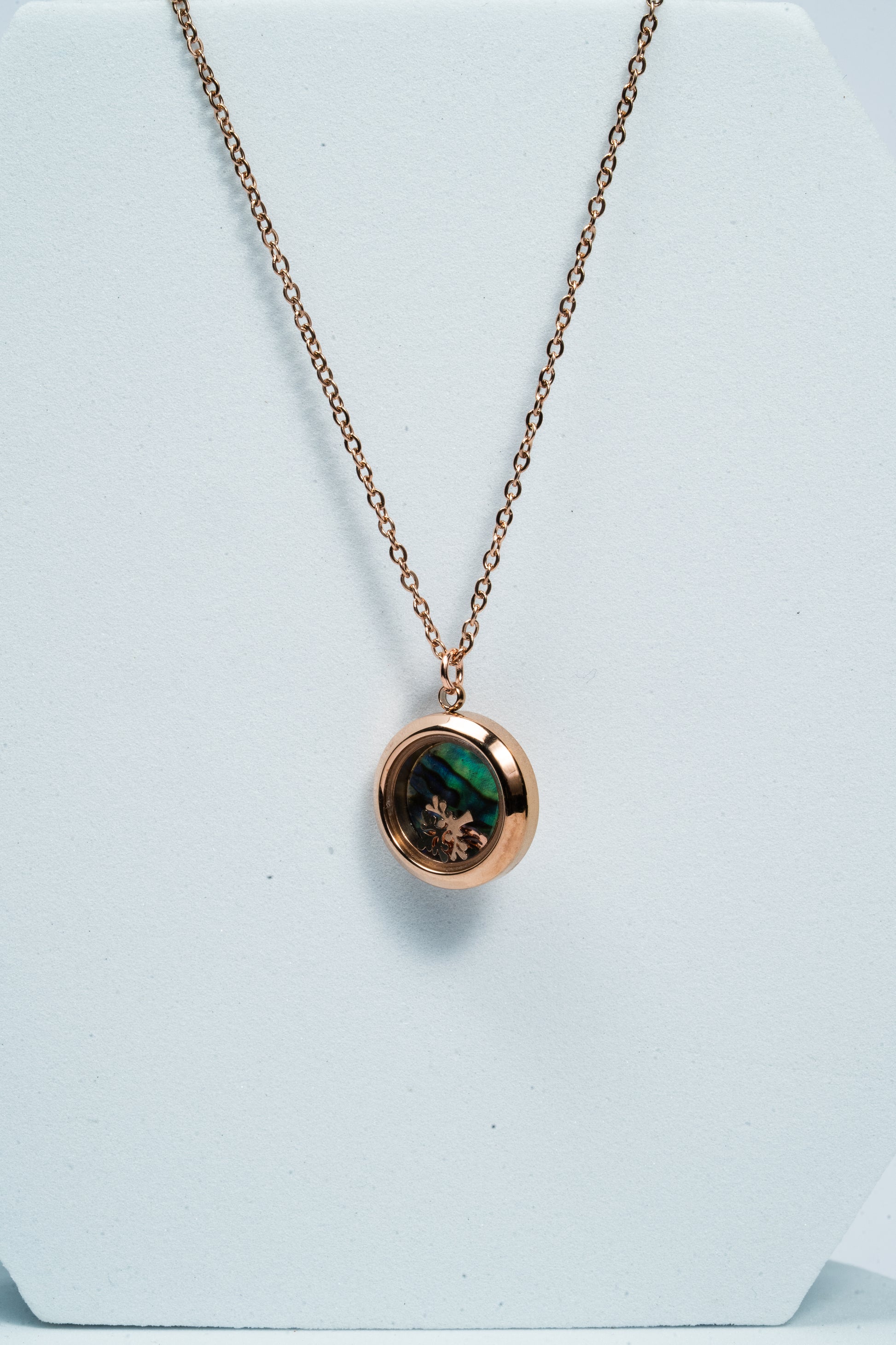 Immerse yourself in natural beauty with the Ocean Bloom Abalone Pendant Necklace. This unique piece features a circular pendant framed in polished rose gold, showcasing a mesmerizing slice of genuine abalone shell. Each shell displays vivid ocean hues—from deep emerald greens to sapphire blues—ensuring no two pendants are alike.