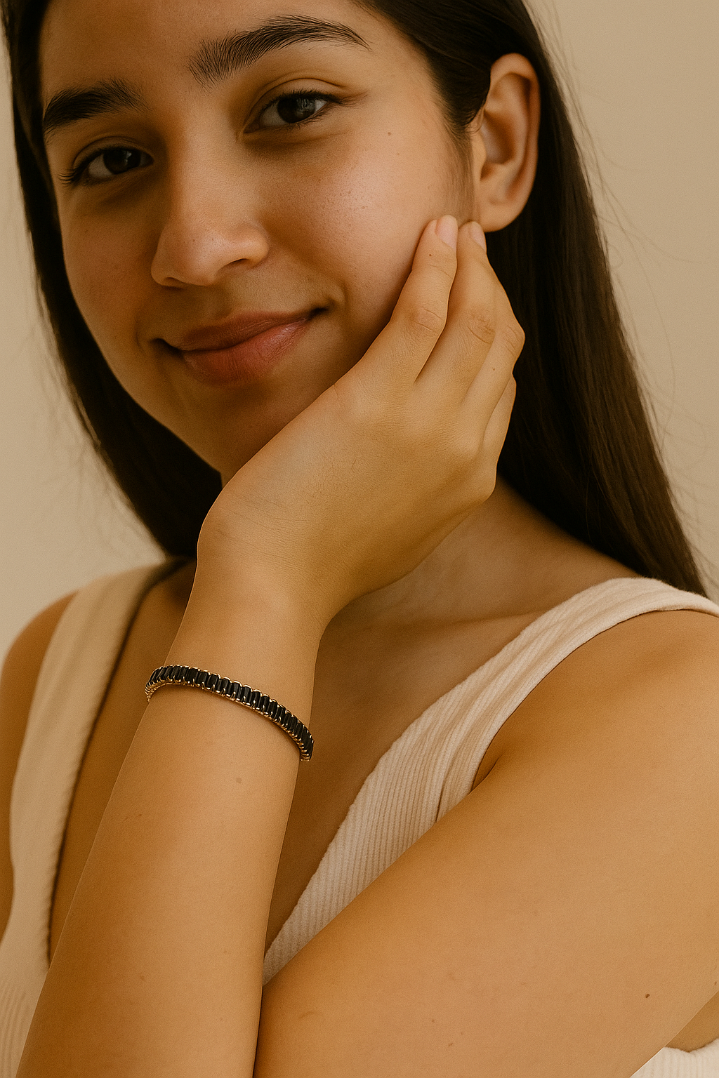 "The Black Tie Glam Bracelet is where timeless elegance meets modern edge. Adorned with sleek black baguette stones set in a radiant gold frame, this piece is designed to elevate both formal looks and everyday style. For your comfort, the bracelet can be easily adjusted — the back hook is removable, allowing you to shorten or extend the length for a perfect custom fit."