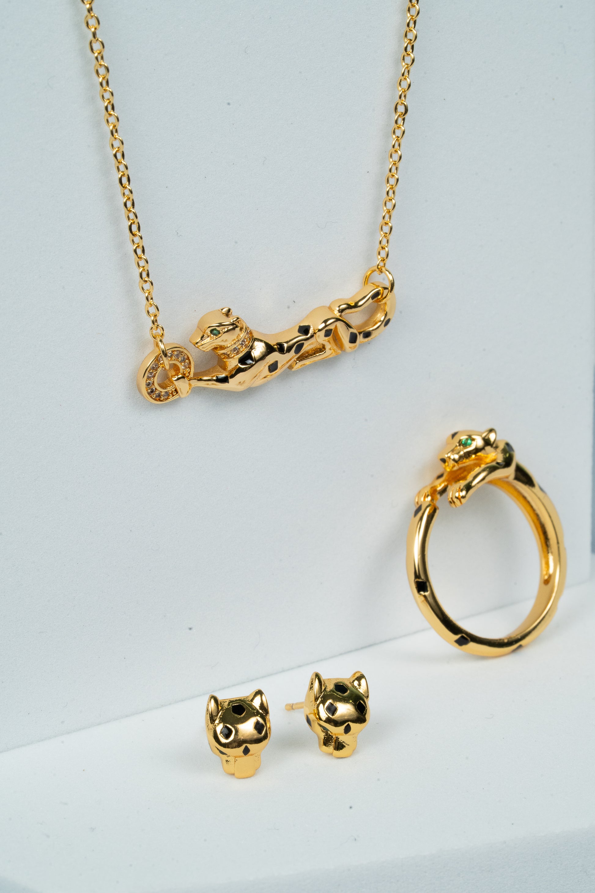 Unleash your inner power with our Fierce Feline Gold Jewelry Set, a bold tribute to wild elegance. This unique trio includes a sleek panther pendant necklace, a matching statement ring, and adorable panther stud earrings. Each piece is meticulously crafted in 18K gold-plated alloy and accented with enamel details and sparkling cubic zirconia stones, capturing the mystique and strength of the majestic wildcat.