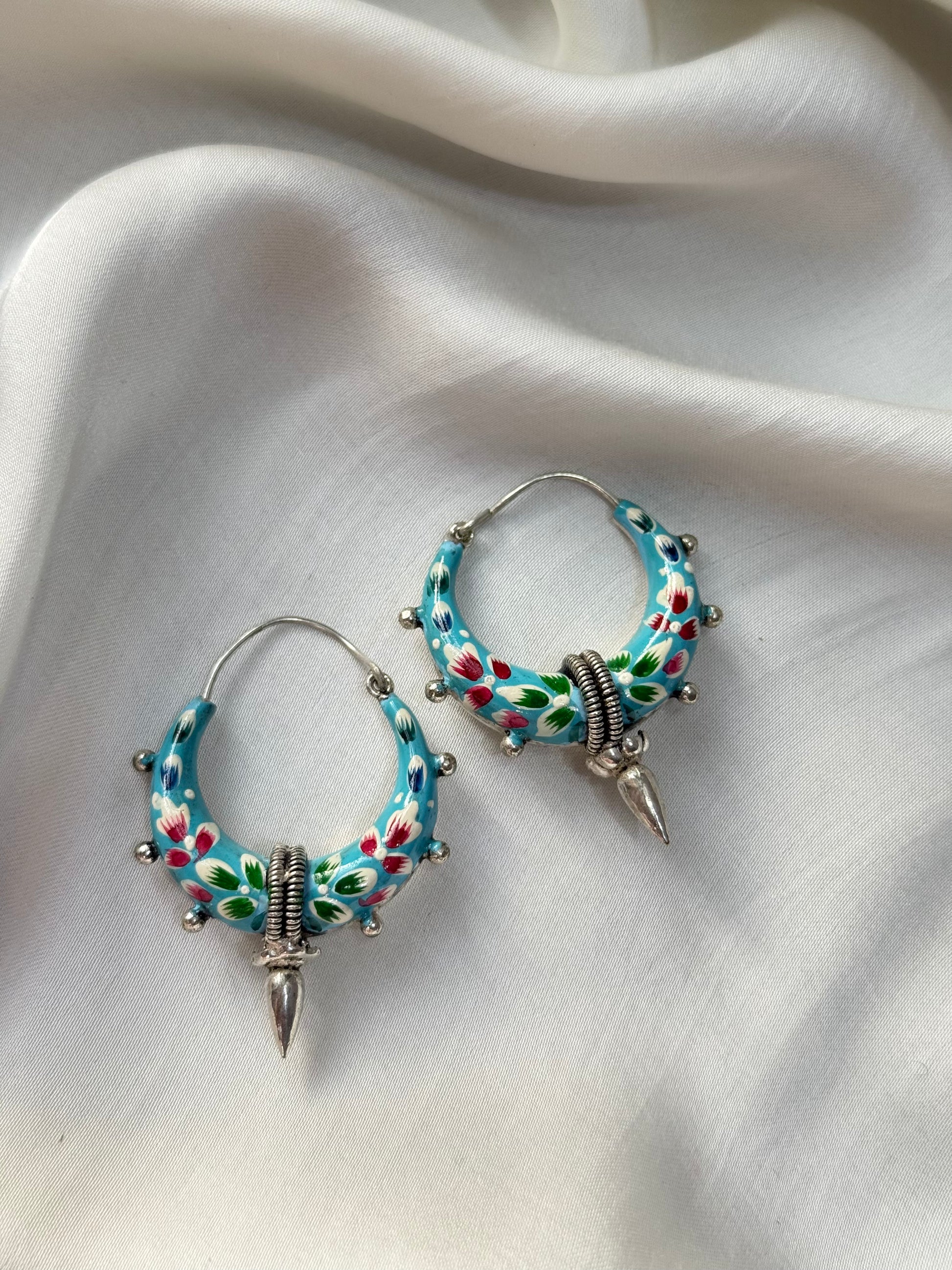 Hand-enamelled crescent hoops in turquoise with vibrant floral detailing and oxidised silver accents. Chic, colourful, and perfect for ethnic or fusion looks.