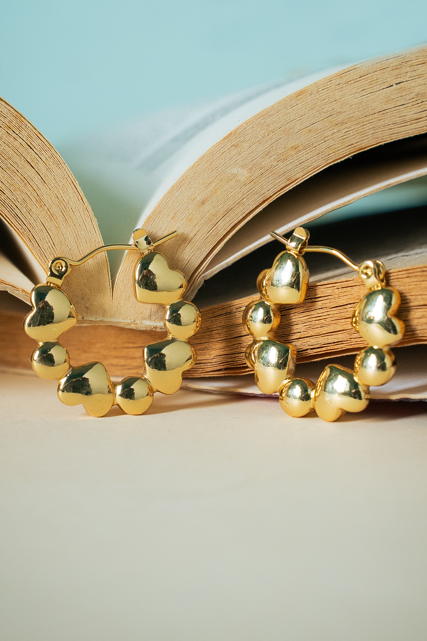 "Crafted in glowing gold, the Eternal Hearts Hoops blend timeless elegance with a touch of romance. Each heart glimmers with charm, making these hoops perfect for adding love to your everyday look or a special night out."