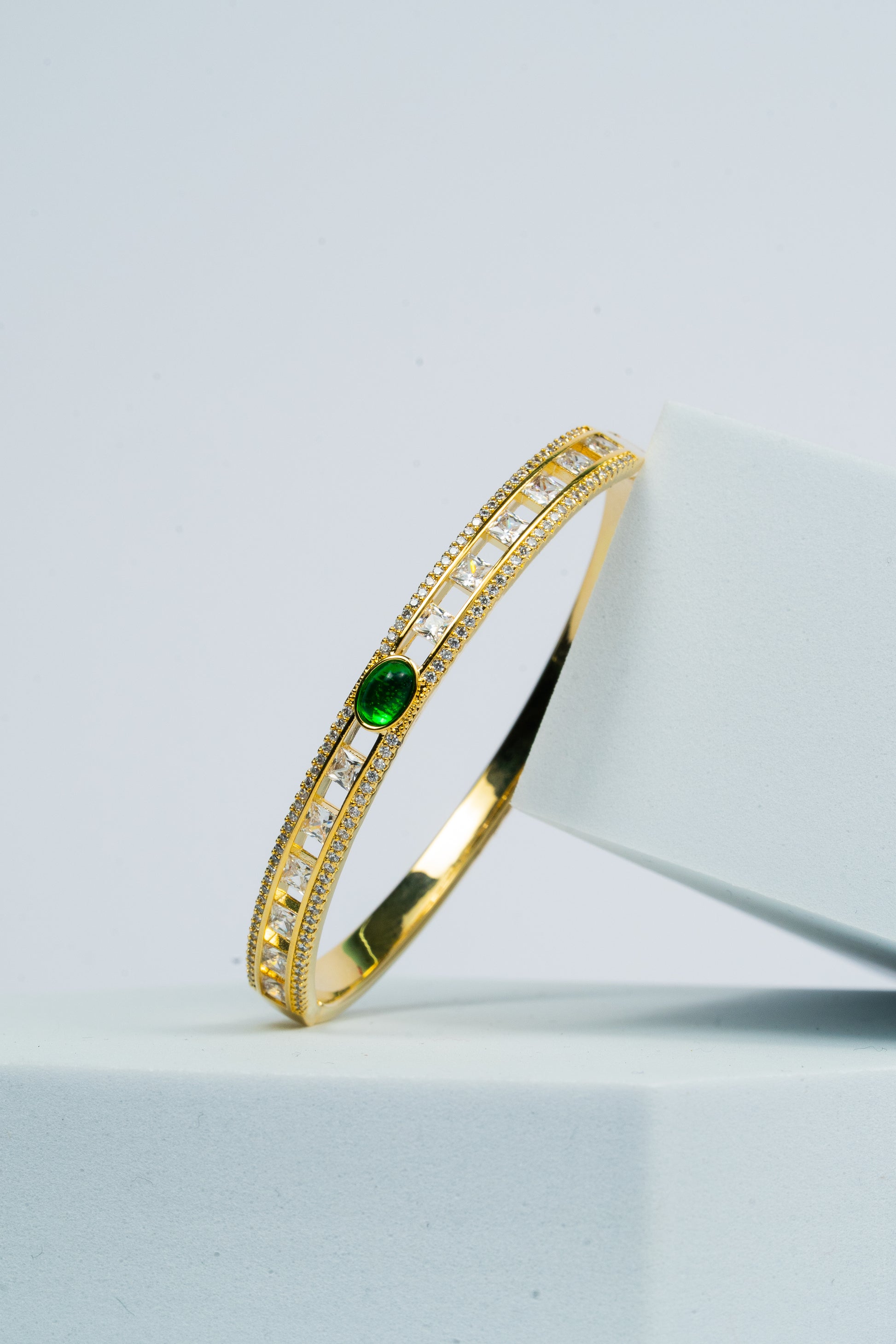 Elevate your jewelry collection with the Emerald Whisper Diamond Bangle, a stunning blend of classic charm and modern sophistication. This meticulously crafted bangle features a central oval-cut green stone that draws the eye with its deep, gem-like hue — reminiscent of lush emerald forests.