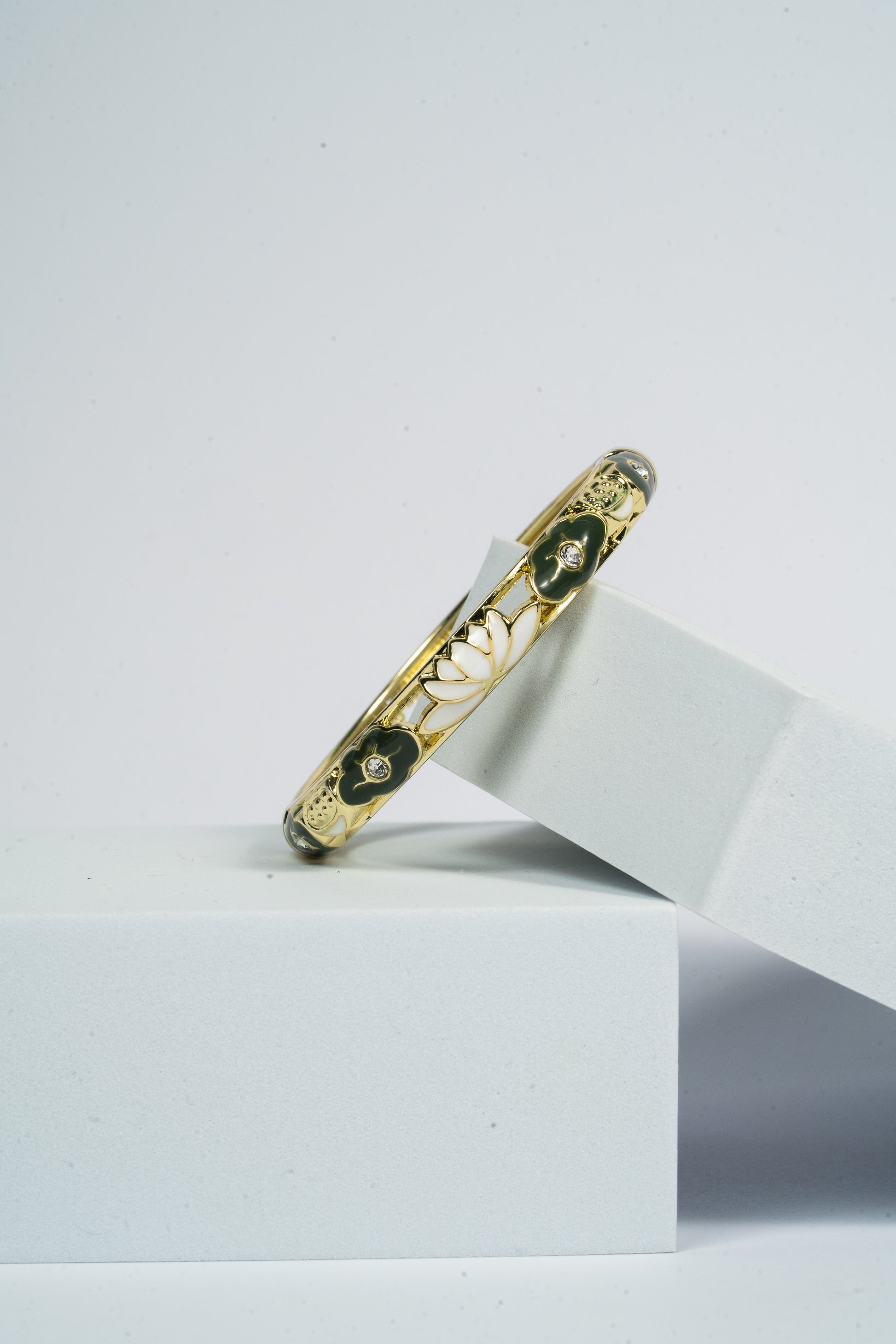 Step into serenity with the Lotus Whisper Enamel Bangle, a tribute to elegance, growth, and inner peace. Featuring delicate lotus petals and soft floral accents in ivory and olive enamel, this bangle brings nature’s harmony to your wrist. A touch of crystal sparkle adds just the right amount of glam to this spiritual and stylish piece.