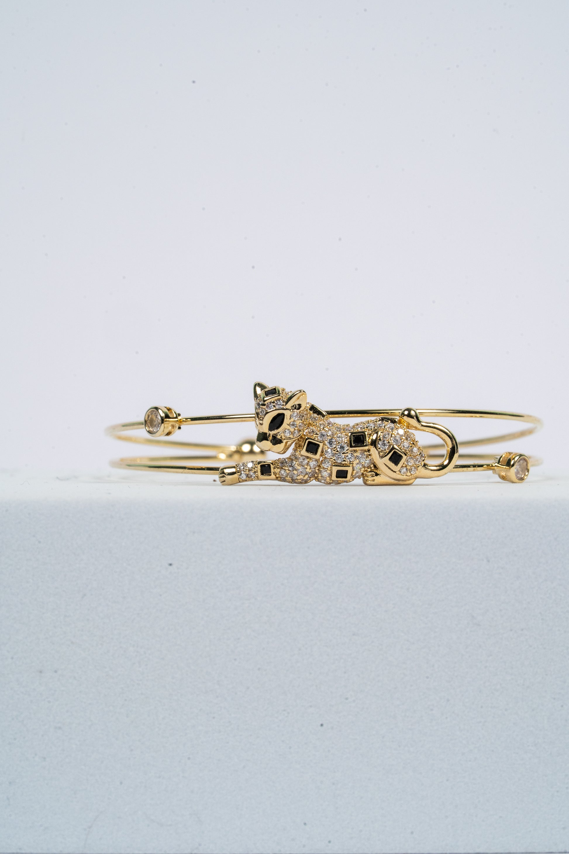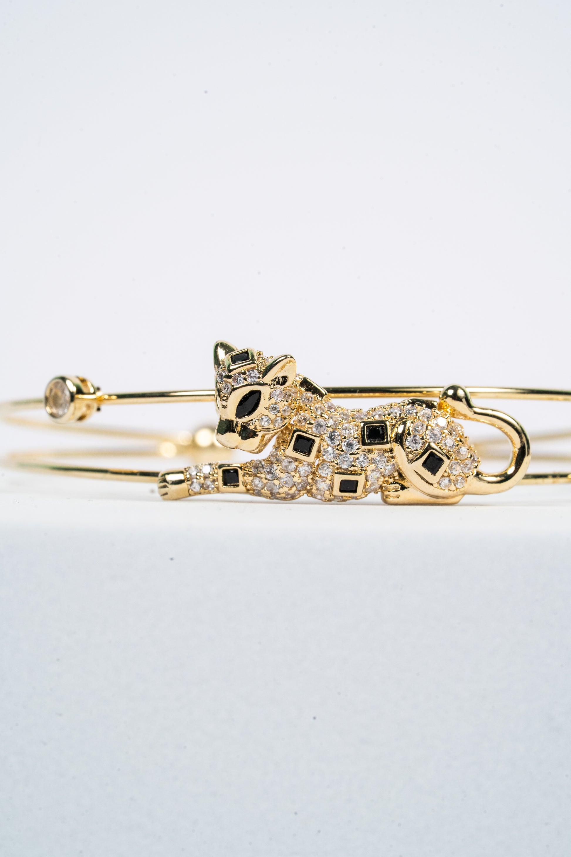 Unleash your fierce elegance. The WildWhisper Panther Cuff features a dazzling panther motif encrusted with sparkling crystals and detailed black enamel inlays. Designed to hug the wrist with a delicate, double-band gold finish, this bracelet blends animalistic grace with high fashion glam.