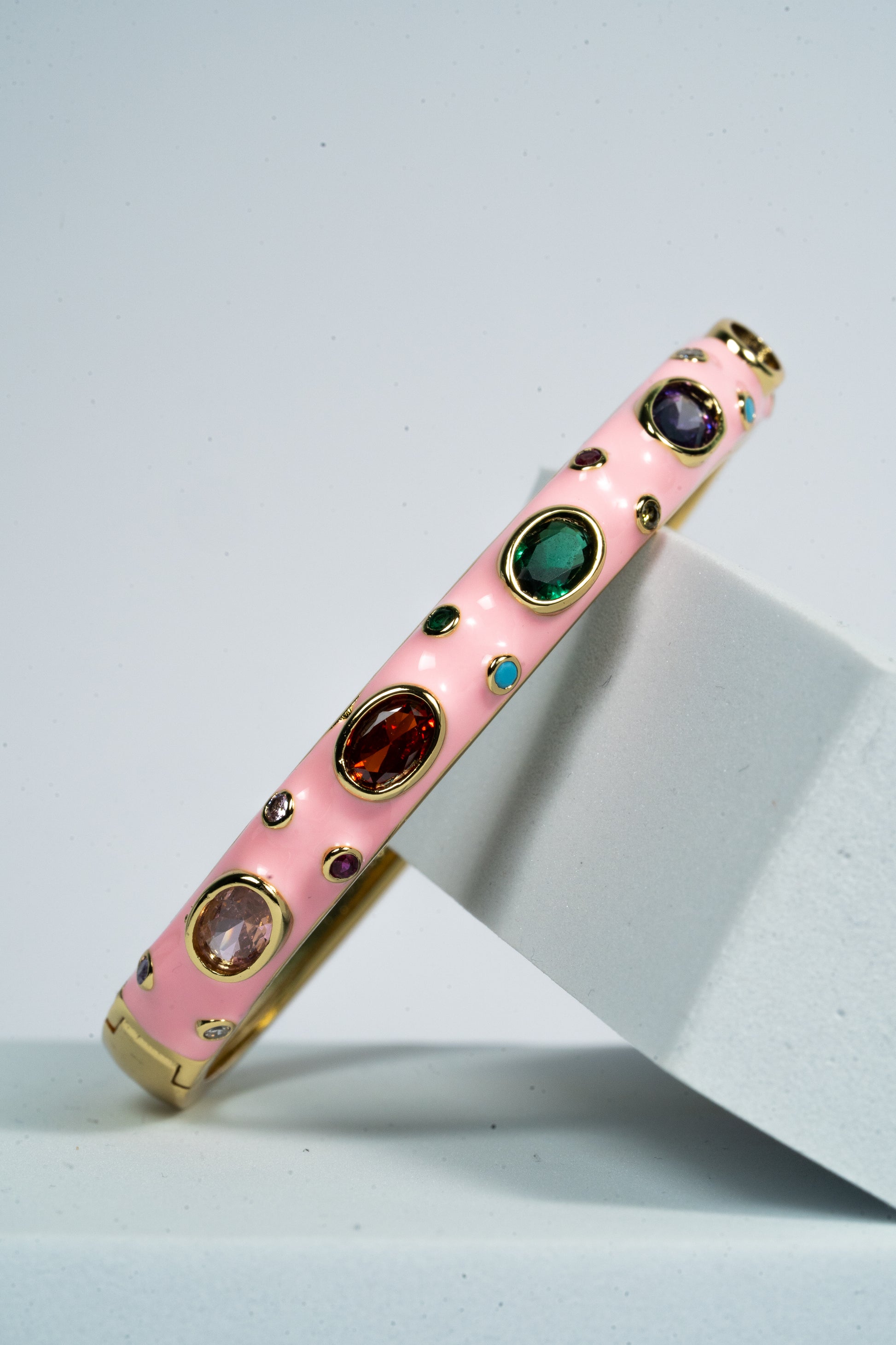 Sweet, chic, and impossible to ignore—the Candy Luxe Gem Bangle is a delicious pop of color for your jewelry collection. Drenched in glossy blush-pink enamel, this bangle is sprinkled with a dazzling array of multicolored gemstones in bold oval and round settings. From sparkling emerald green and rich garnet red to soft rose quartz, every stone shines with its own vibrant personality.