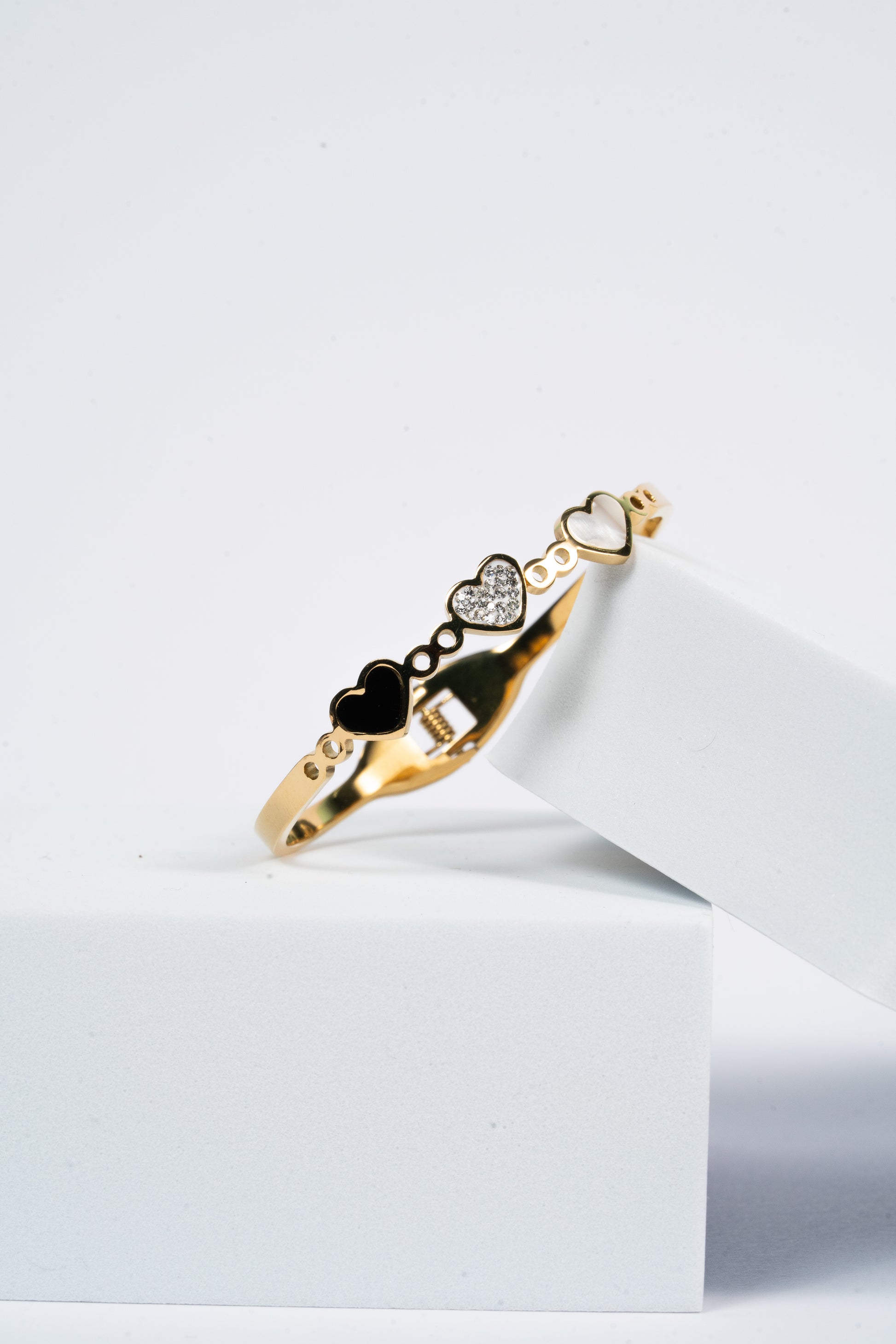 The hearts are connected by delicate gold links, creating a fluid and feminine silhouette that rests comfortably on your wrist. Designed for those who adore meaningful accessories, this bangle adds a romantic statement to everyday outfits or occasion wear.