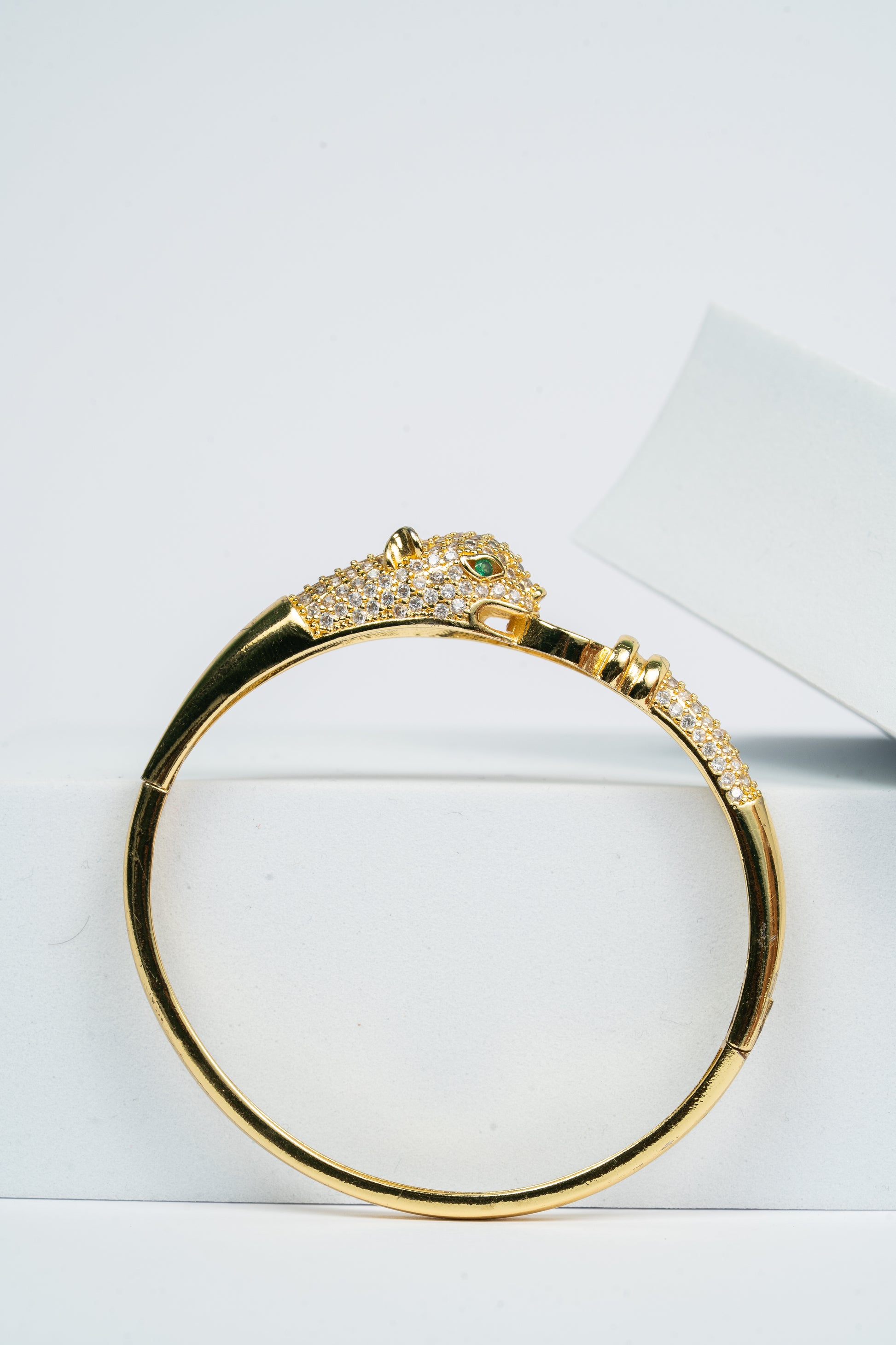 A symbol of stealth, power, and grace — the Emerald Panther Cuff channels the fierce elegance of the wild. This exquisite bracelet features a sculpted panther head encrusted with glistening cubic zirconia stones and piercing emerald-green eyes. Crafted in high-polish gold finish, it’s more than a piece of jewelry — it’s a statement of bold femininity.