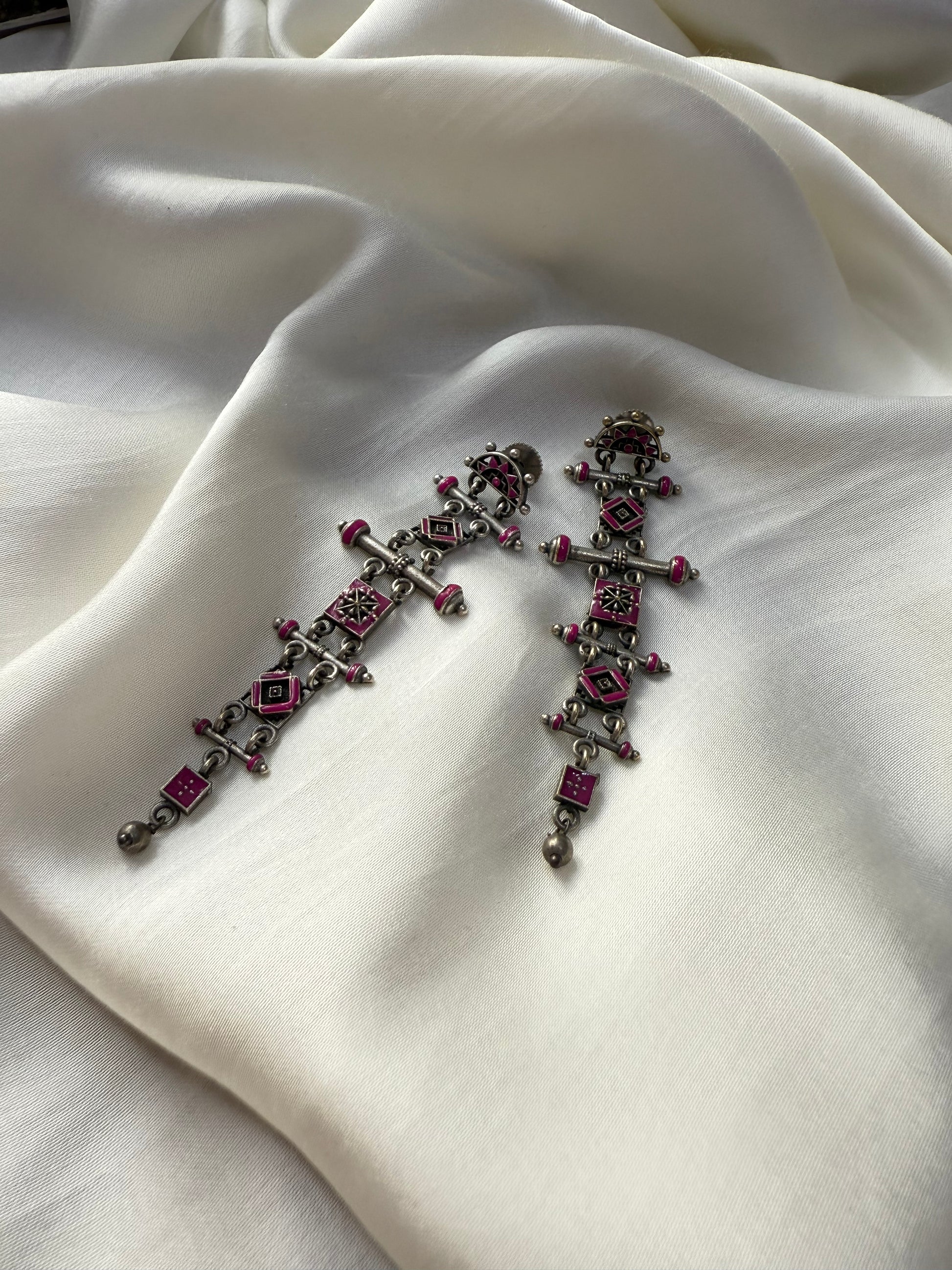 Statement oxidised silver bar earrings featuring handcrafted tribal motifs and vibrant magenta enamel. Lightweight yet striking — perfect for festive and fusion looks