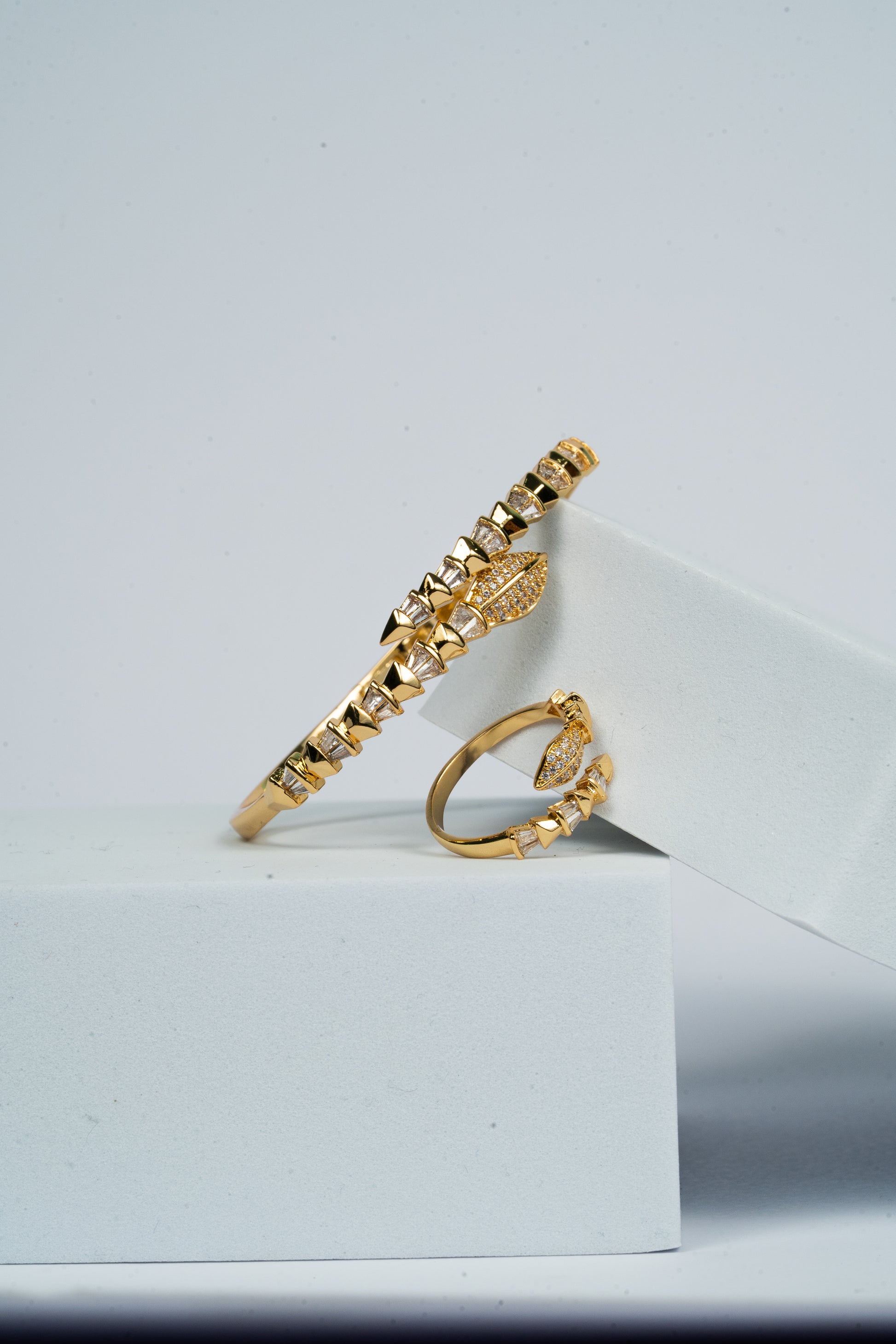 Fierce. Refined. Unforgettable. The Serpenté Luxe Set evokes the hypnotic beauty of a serpent in motion — a powerful symbol of strength and transformation. Featuring a bracelet and matching ring with alternating pyramid-cut crystals and gold scales, the set culminates in a dazzling serpent head encrusted with micro pavé zirconia stones.